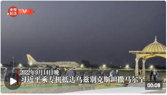 当地时间14日晚,国家主席习近平乘坐专机抵达乌兹别克斯坦撒马尔罕国际机场。