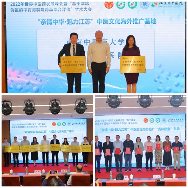 开幕式上,与会领导为江苏省侨联“亲情中华·魅力江苏”中医文化海外推广基地、推广中心、“杏林使者”代表颁发了铜牌和聘书。