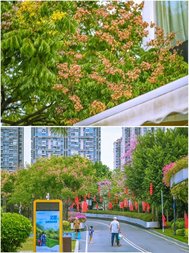 「澄澈蓝天,橘粉花丛,绿油枝叶,尽显秋日之美」