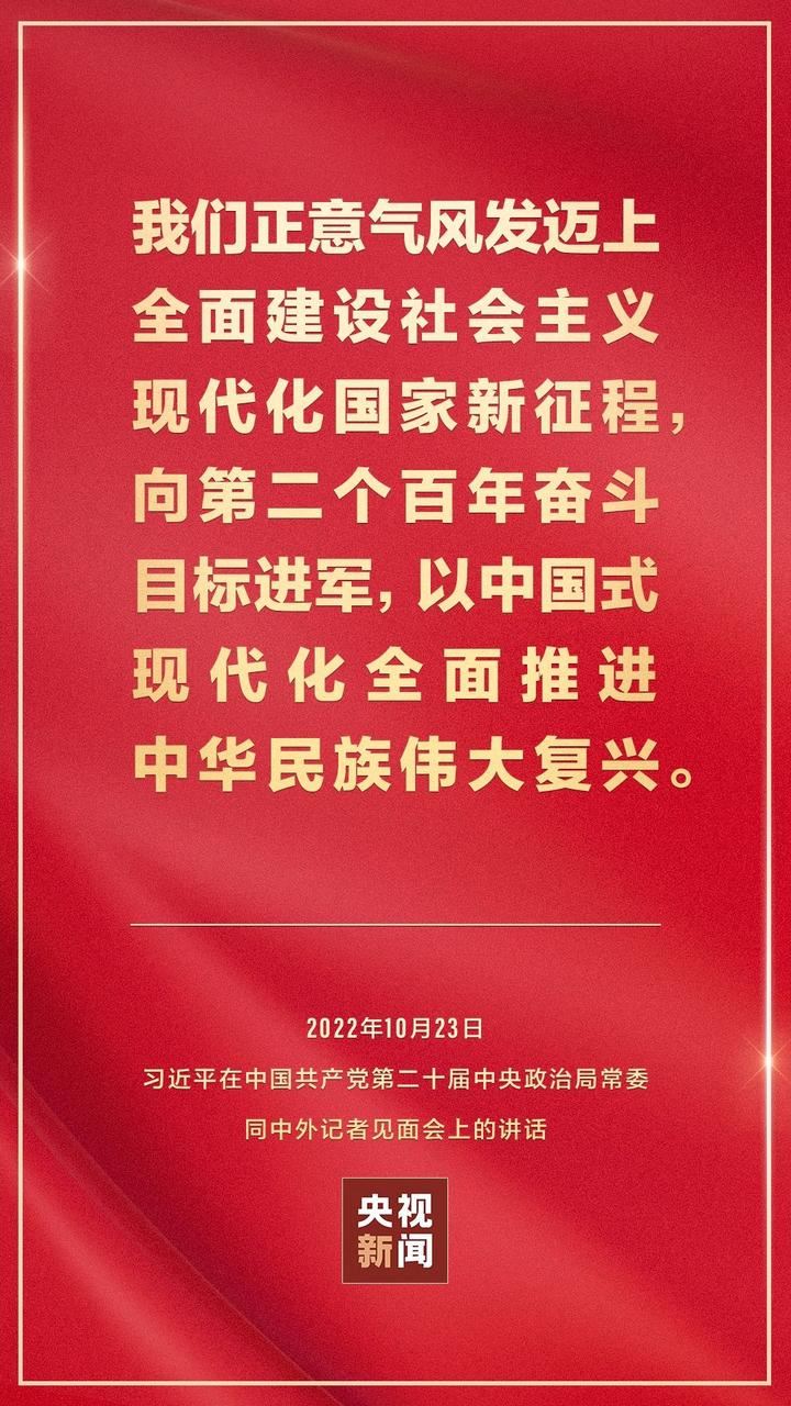 “现在,我们正意气风发迈上全面建设社会主义现代化国家新征程,向第二个百年奋斗目标进军,以中国式现代化全面推进中华民族伟大复兴。”10月23日中午,中国共产党第二十届中央政治局常委同中外记者见面。中共中央总书记习近平在讲话中阐明新时代新征程中国共产党的中心任务,强调要不断把人民对美好生活的向往变为现实,以中国自身发展为世界创造更多机遇。