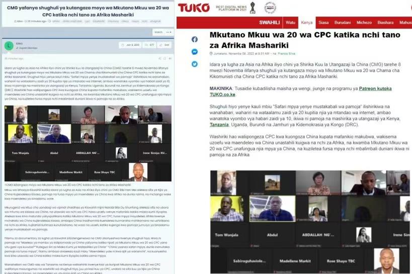 在东非五国举办的“新征程 共命运”中共二十大精神宣介活动中,总台亚非中心斯瓦希里语部负责人为与会者解读了中国式现代化的特点,介绍了中国在自身发展中不断给非洲和世界提供新的发展机遇。总台内罗毕节目制作室负责人重点介绍了中共二十大的成果、中国政治体制的特点和优越性,以及新时代十年发展的成功经验。参与二十大报道的总台坦桑尼亚籍记者、肯尼亚籍记者也分别参与线上交流,介绍报道经历及亲身感受。与会嘉宾盛赞中国共产党领导中国取得的巨大成就,表示中国的发展经验对非洲很有借鉴意义。
