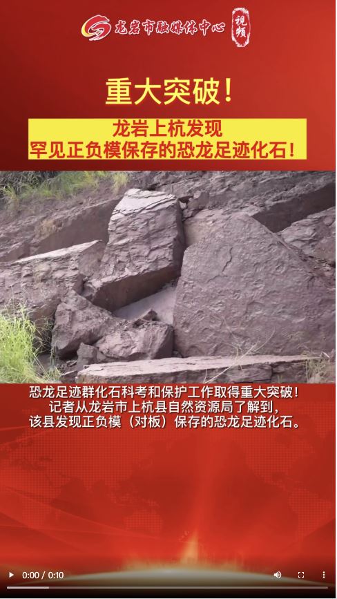 上杭恐龙足迹群化石于2020年11月被首次发现,经自然资源部国家古生物化石专家委员会相关专家实地考察认定,这是中国发现的多样性最高的晚白垩世恐龙足迹群之一,也是福建省恐龙相关化石的首次发现。随着科考保护工作的推进,不断有新的发现。目前,已清理发现多种恐龙足迹类型,并至少发现4个层位,证明恐龙在这个地区有较长的生活史。