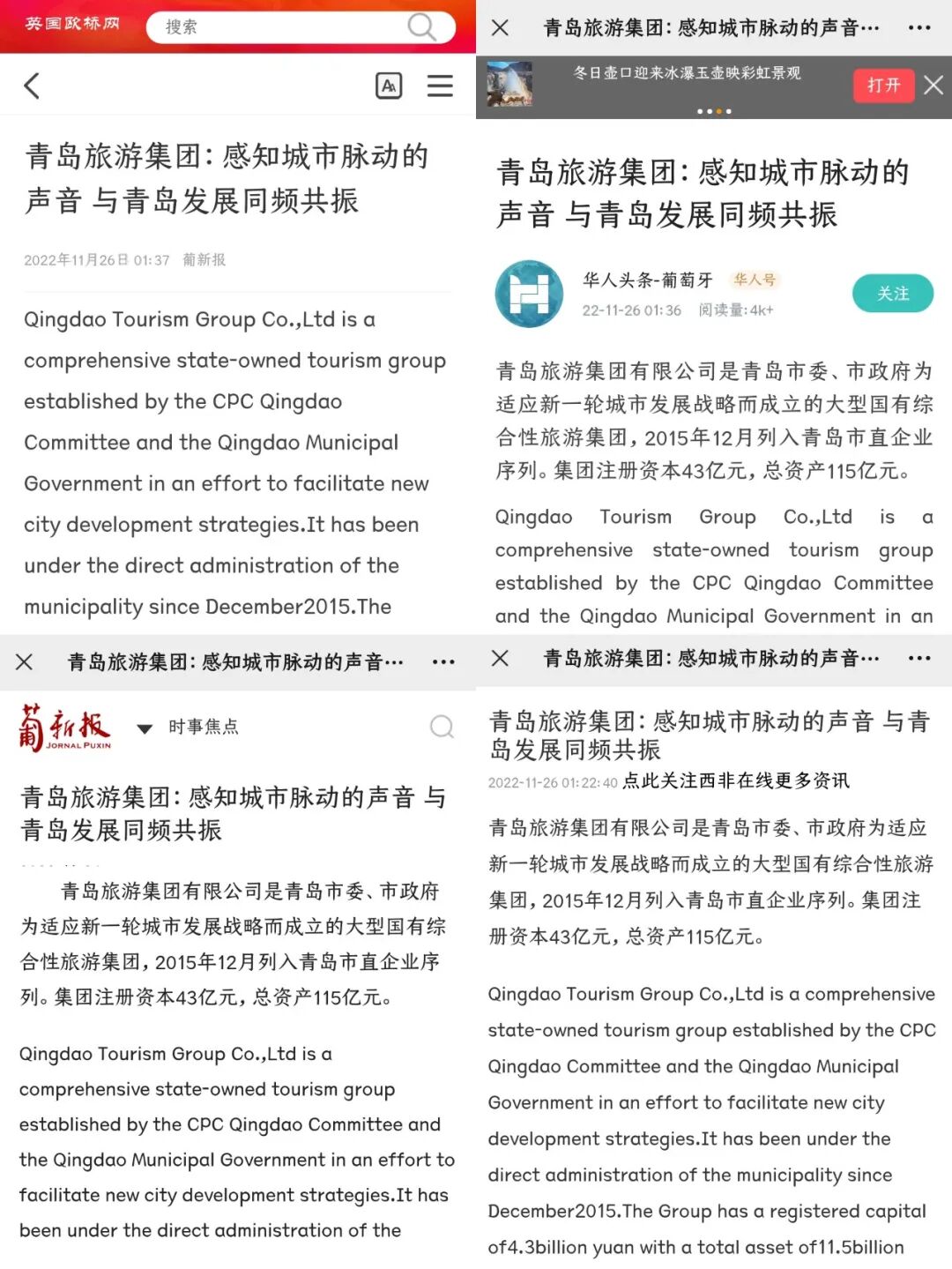 截止发稿时间,题为“青岛旅游集团:感知城市脉动的声音,与青岛发展同频共振”的宣传新闻已在葡新报、华人头条、欧侨网、西非在线等十余家外国华侨媒体及“脸书”上进行广为传播。