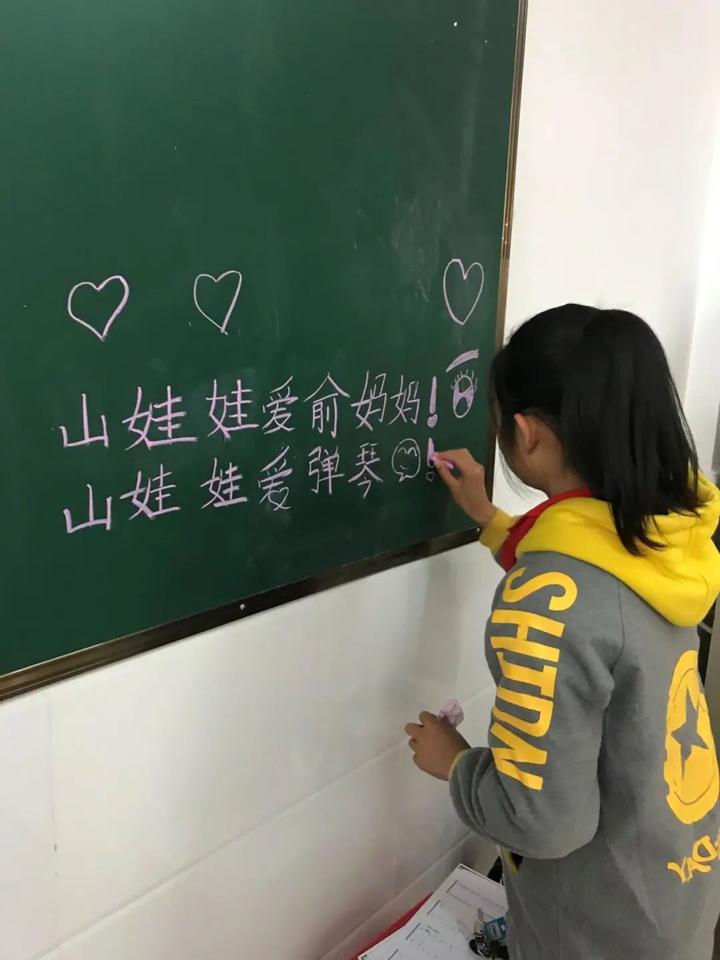 古筝教室的黑板平日用得不多,后来几乎成了孩子们的“表白墙”:“俞妈妈:大爱无疆,您是改变山娃娃命运的人。”“俞妈妈:指尖流淌师恩,琴韵伴我成长。”……