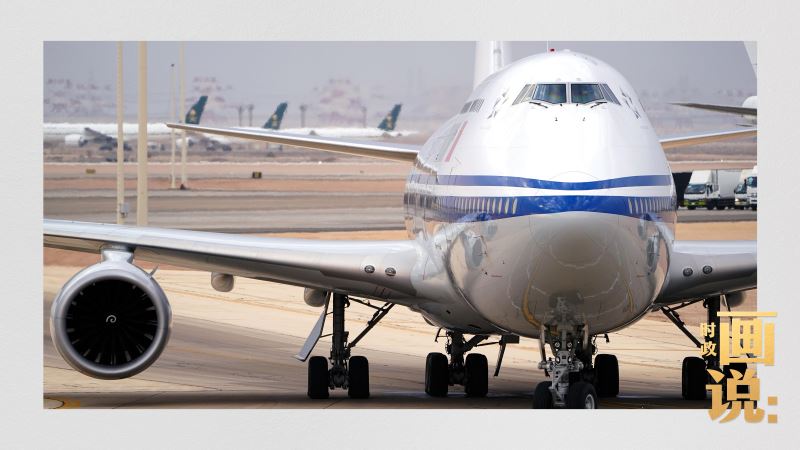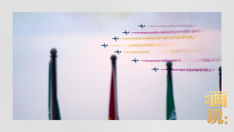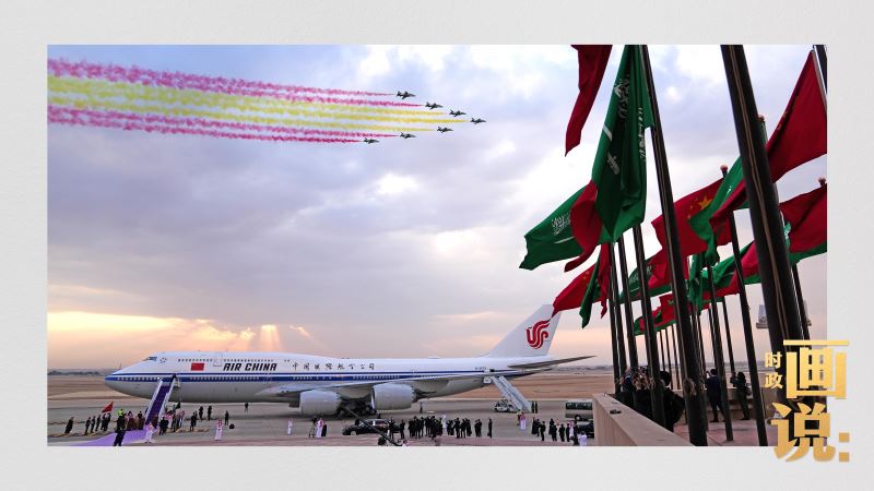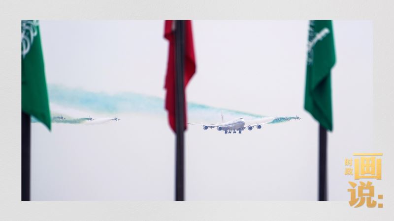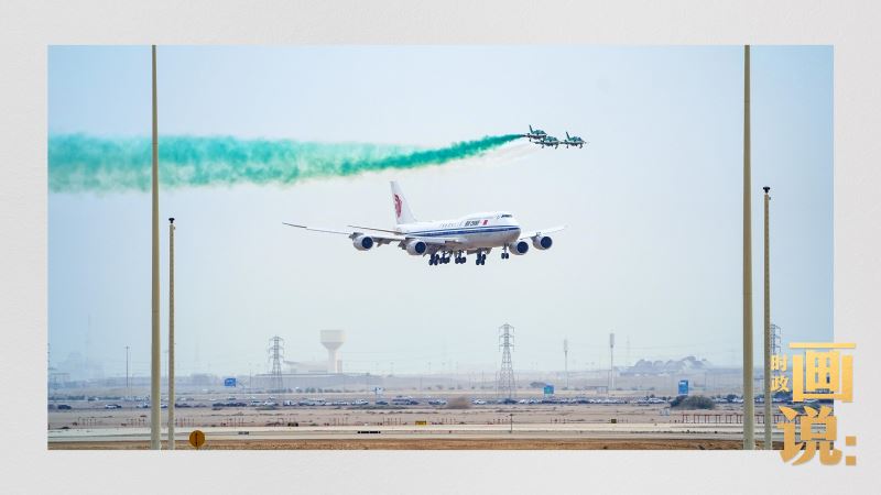 习近平乘坐的专机进入沙特领空后,沙特空军4架战机升空护航。专机进入利雅得上空后,6架“沙特之鹰”礼宾护卫机随行伴飞。机场鸣放21响礼炮,礼宾护卫机在空中拉出象征中国国旗的红黄两色彩带。