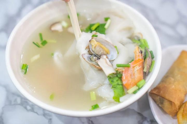 功夫好的师傅泼米浆快准狠,薄薄一层,熟米浆片铲到汤里,汤里有紫菜虾米等提鲜小味,出锅前撒上一把芹菜碎。