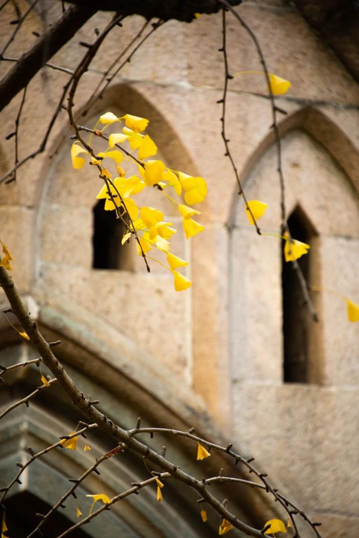 在石厝教堂和银杏树的投影和树荫里,聆听落叶倾泻的优美旋律,静赏一场纷纷扬扬的金色雨。