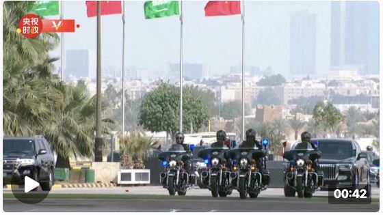 当地时间12时20分许,在沙特王宫摩托车队和马队护卫下,习近平乘车抵达王宫办公厅广场。