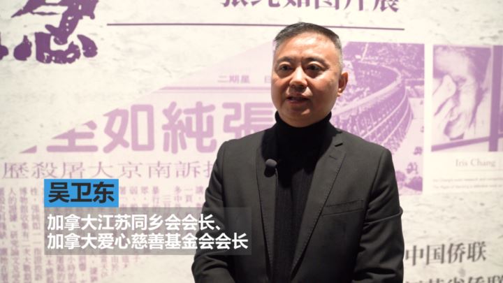 加拿大江苏同乡会会长、加拿大爱心慈善基金会会长吴卫东表示:“今天我怀着敬仰的心来参加展览,张纯如和我同为淮安人,她不仅是淮安人的骄傲,也是海外华人的骄傲,她以笔为武器,用生命为南京大屠杀30万遇难同胞冤魂正名。历史不容否认,作为海外侨胞,一直以来,只要有海外朋友来南京,我一定想方设法邀请他去“侵华日军南京大屠杀遇难同胞纪念馆”参观。另外,我们还采购张纯如英文版著作《南京大屠杀》送给在加拿大的朋友们,以实际行动宣传张纯如的事迹,告知我们周围人以及我们后人,不能忘却这段刻苦铭心的记忆。”