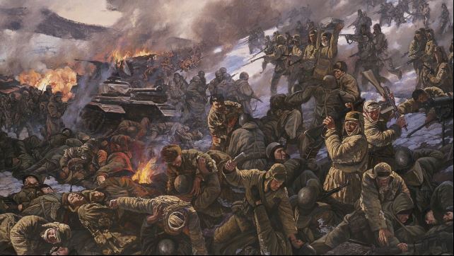 作品《激战松骨峰》描绘了志愿军战士在松骨峰英勇战斗的画面。这幅作品,画面充分展现了油画艺术的魅力,战火硝烟的激烈与天寒地冻的冷色调雪山,构成了色彩上的冷暖交错,也展现了松骨峰战斗的惨烈,充分展现了志愿军战士英勇顽强、无畏牺牲的精神。这幅作品被中国人民革命军事博物馆收藏。曾有7名志愿军老战士在军博看到了这幅画,激动不已。当老兵们见到孙立新时,不禁潸然泪下。他们握着孙立新的手说:“真是感谢你,还没忘了我们。”老人们真挚的话语和眼神,也让孙立新动容。