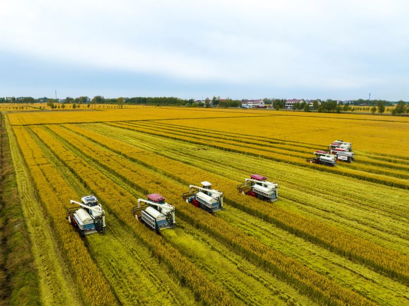 △2022年10月26日,江苏省连云港市东海县平明镇,金色稻田喜获丰收。