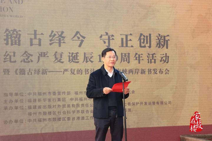 福州市鼓楼区委书记黄建新在致辞中表示,严复先生严谨治学、首倡变革、追求真理、爱国兴邦,他的品格是海峡两岸共同的精神财富,更是鼓楼城市精神的重要组成部分。鼓楼将继续深入挖掘严复文化内涵,将严复文化与弘扬闽都文化、推进两岸文化交流、加强文化遗产保护、增强文化自信结合起来,多形式宣传推介严复思想,创新开发更多文创产品,助力福州打响闽都文化国际品牌。
