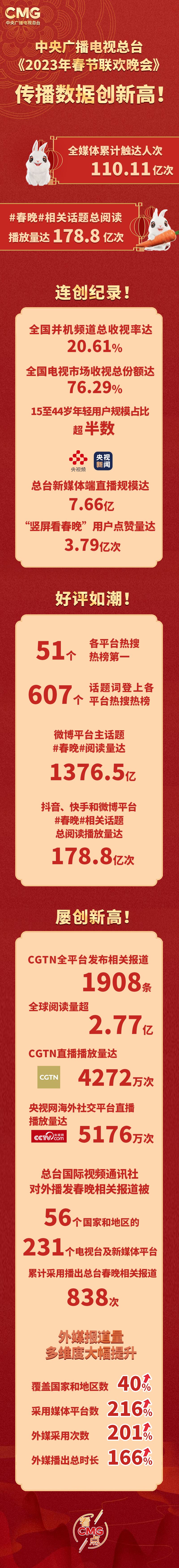 海外传播创下多项新纪录。总台CGTN(中国国际电视台)英西法阿俄语频道和68种语言对外新媒体平台,联动来自美国、加拿大、法国、德国、意大利、西班牙、澳大利亚、俄罗斯、日本、阿联酋、新加坡、土耳其、南非、肯尼亚等173个国家和地区的1000多家媒体对春晚进行同步直播和报道。截至1月22日8时,CGTN全平台共发布春晚相关报道1908条,获全球阅读量超过2.77亿。春晚在CGTN直播播放量达4272万次,央视网海外社交平台直播播放量达5176万次,较去年均有大幅增长。
