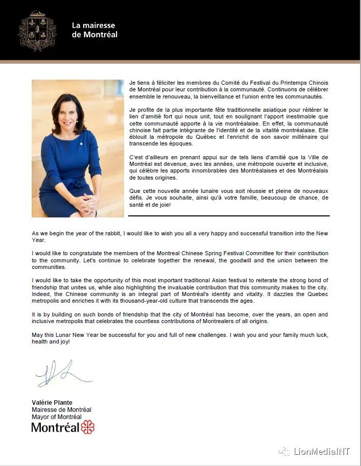 蒙特利爾市市長-Valérie Plante女士-名譽主席贺信