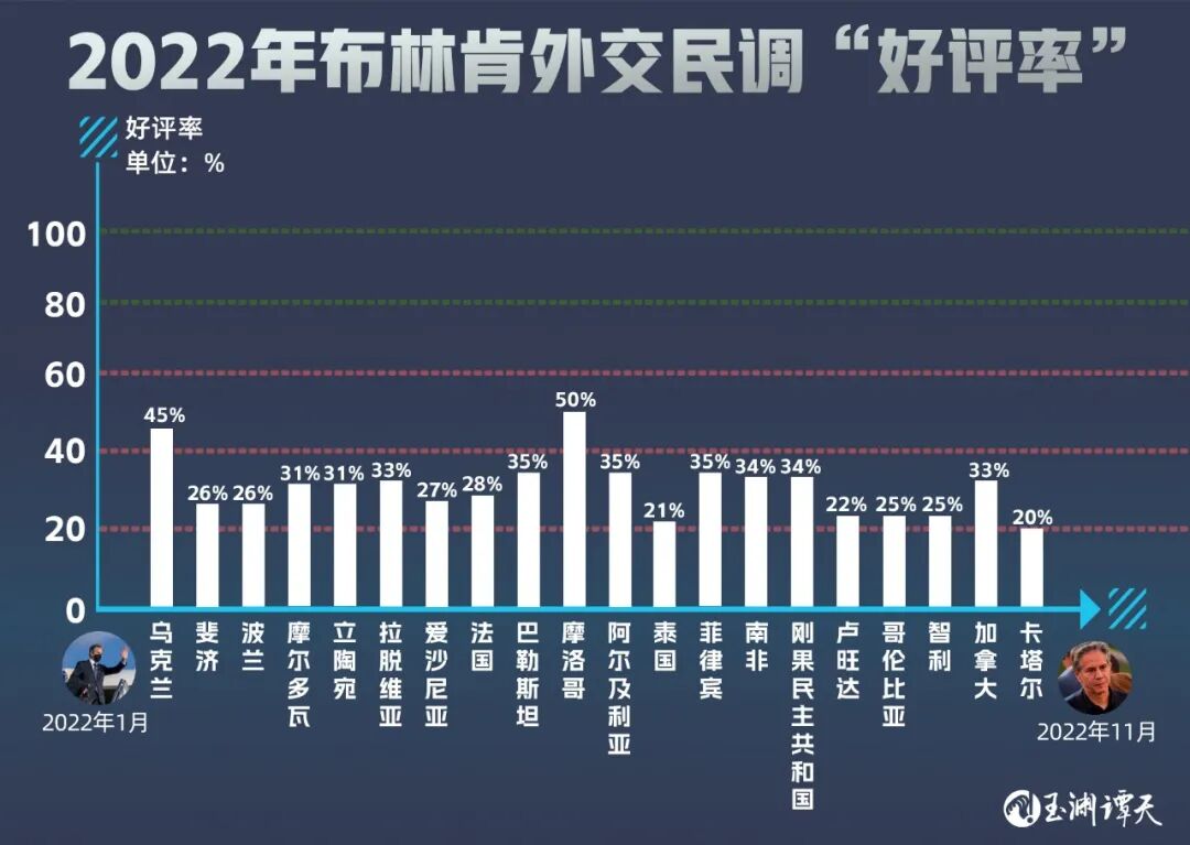 可以看出,布林肯在这些国家的好评度没有超过50%的,大多数低于30%。