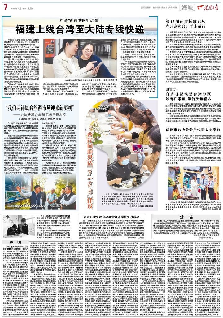 台胞许真真(左)体验台湾小包寄大陆服务。 吴洪 冯诗影 摄 本报讯 (记者 吴洪 实习生 庞嘉荧 冯诗影) 3月15日,经过近一个月的试运营,大陆首个服务台胞的数字化平台——福建“台陆通”正式上线了台湾个人小包寄大陆业务,完成了大陆寄台湾、台湾寄大陆的专线快递闭环。这意味着今后两岸快递往来将像在大陆境内一样快捷,我省在探索两岸融合发展新路上又迈出新步伐。