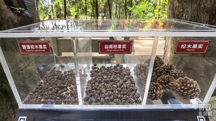 △翠云廊古蜀道,现场陈列的柏木和松木果实。(总台央视记者石丞拍摄)