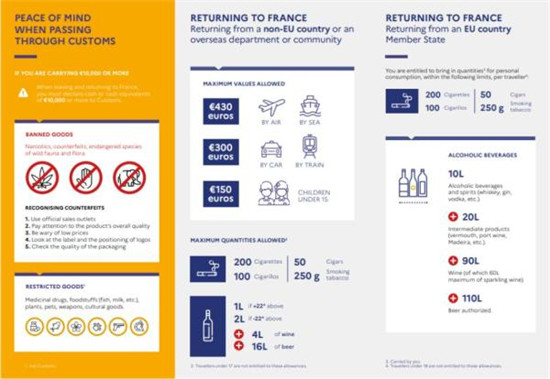 一、多途径了解法国有关法律法规,特别是关于入出境携带物品种类和数量的规定(如香烟、药品、食品、液体、现金等,详见下图),请勿携带违禁品。