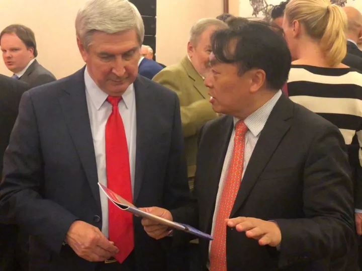 2018年吴昊向俄罗斯国家杜马第一副主席梅利尼科夫介绍《中国新闻》俄文版