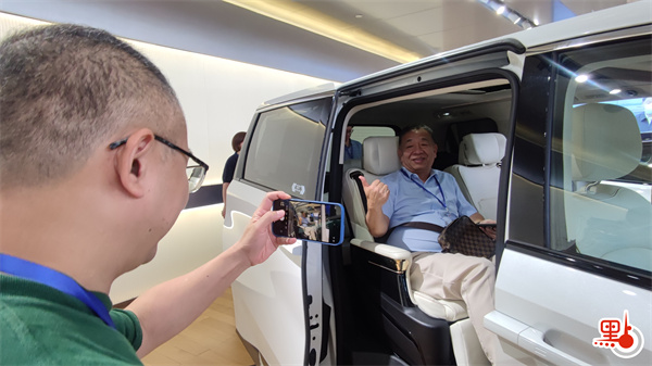 《歐洲僑報》社長高進也試坐了一輛商務車,談到其舒適度忍不住豎起拇指。(點新聞記者盧靜怡攝)