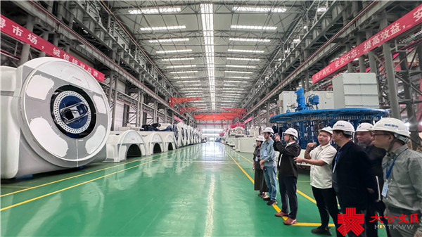 2023海外華文傳媒合作組織廣東省高質量發展主題參訪調研團到廣東明陽新能源科技有限公司走訪,了解混合驅動大型海上風電整機及其關鍵部件的生產情況(大公文匯網記者 黃寶儀 攝)