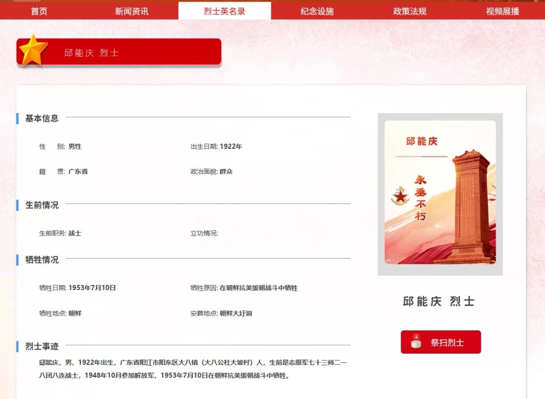 邱能庆烈士来自广东省阳江市