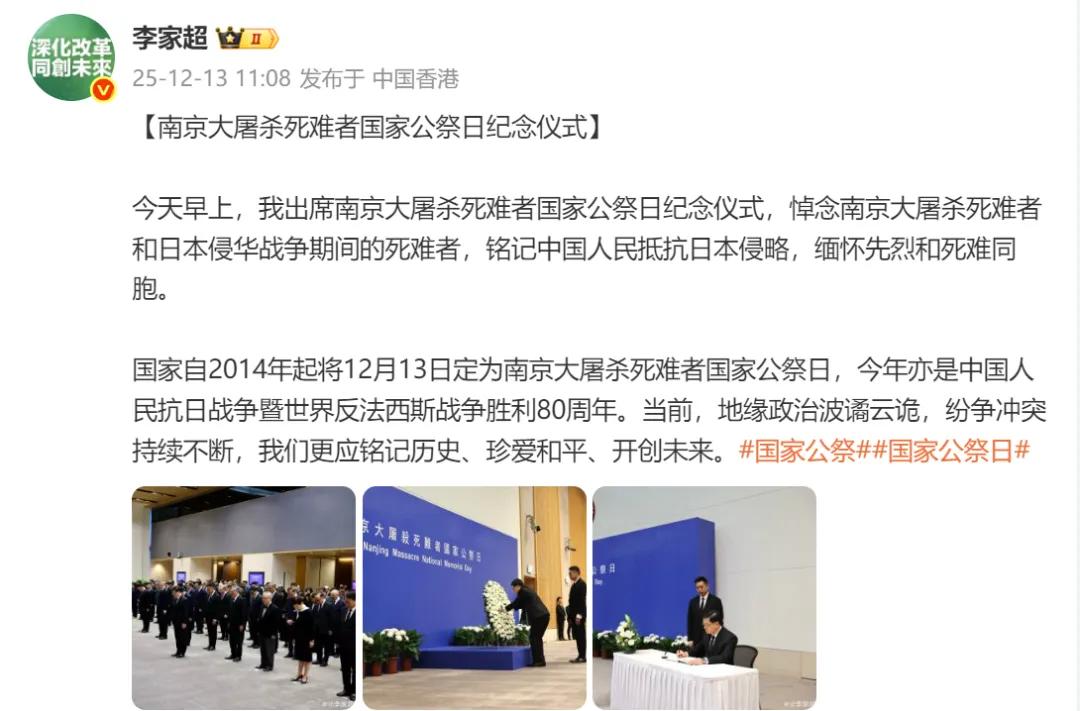 李家超在仪式后发文表示,国家自2014年起将12月13日定为南京大屠杀死难者国家公祭日,今年亦是中国人民抗日战争暨世界反法西斯战争胜利80周年。当前,地缘政治波谲云诡,纷争冲突持续不断,我们更应铭记历史、珍爱和平、开创未来。