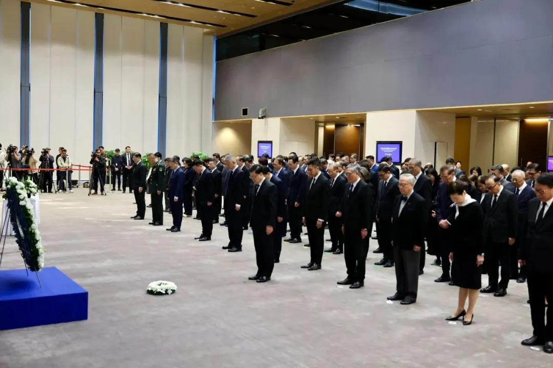 澳门特区行政长官岑浩辉等公祭代表分别上前在公祭台整理花圈缎带并鞠躬。随后,全体人员默哀、鞠躬。