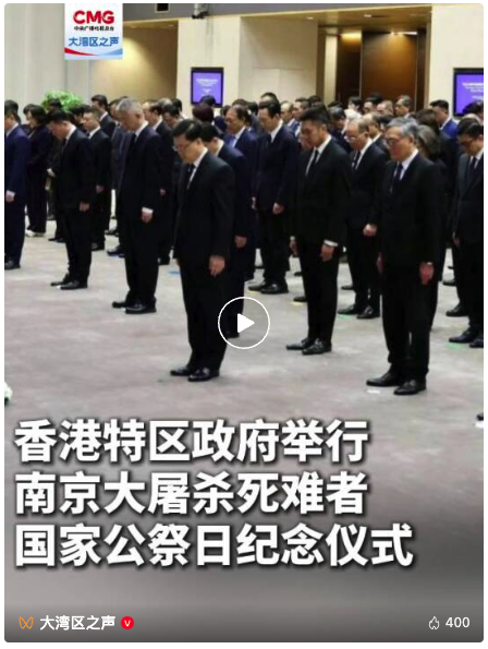 今天(12月13日)是南京大屠杀死难者国家公祭日。香港特区政府在政府总部举行南京大屠杀死难者国家公祭日仪式,悼念南京大屠杀死难者和日本侵华战争期间的死难者,铭记中国人民抵抗日本侵略,缅怀先烈和遇难同胞。