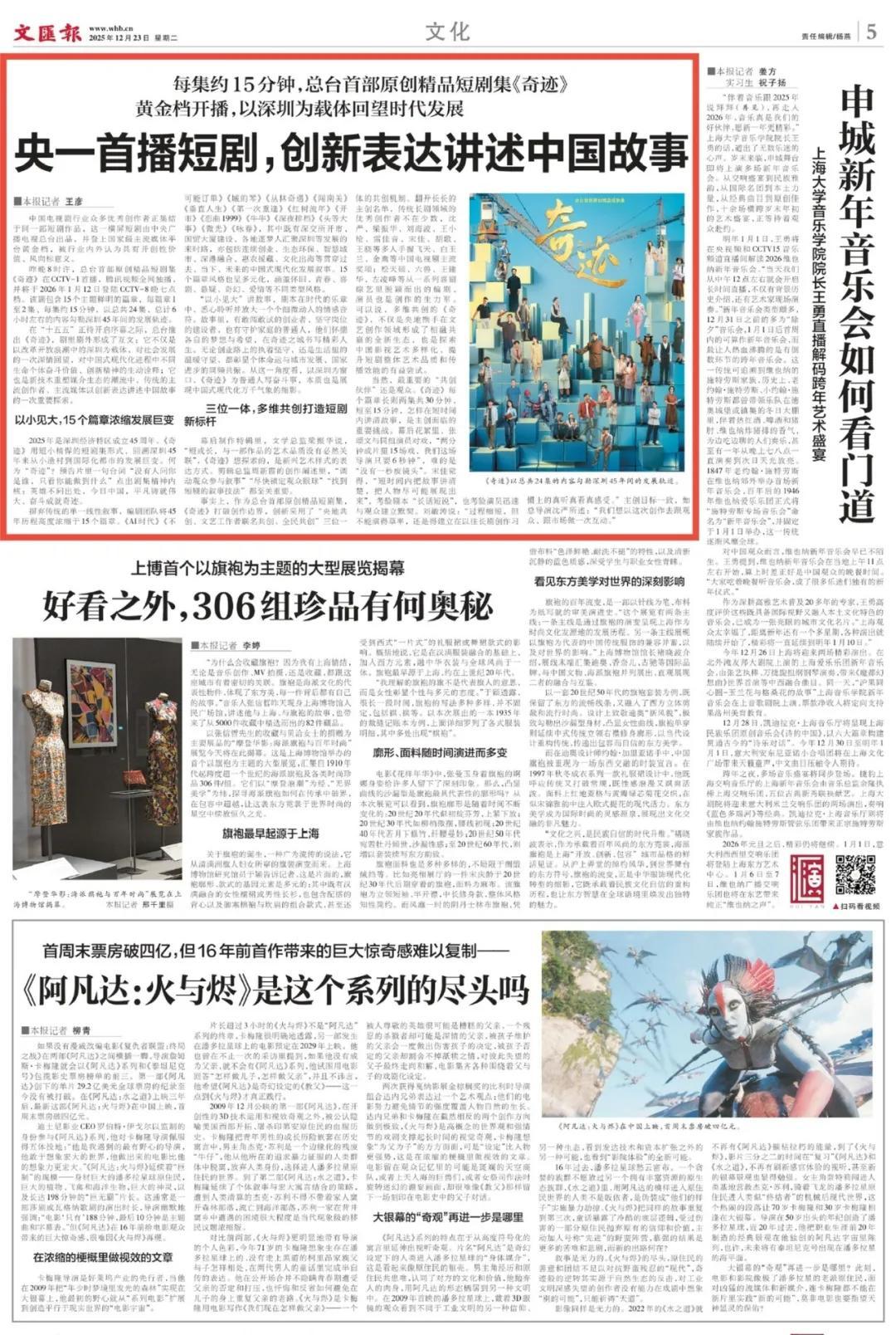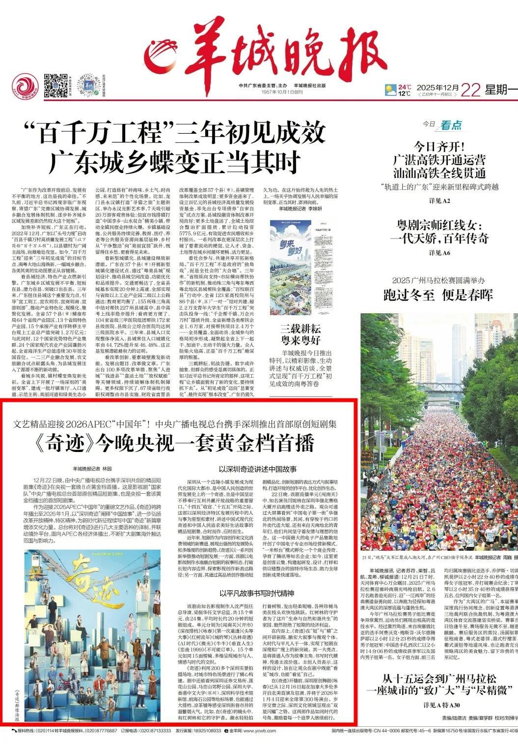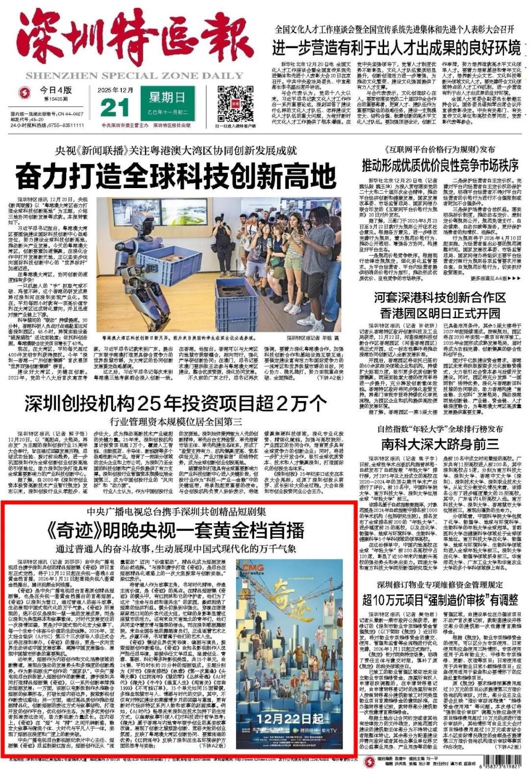 12月22日晚8点,由中央广播电视总台携手深圳共创的精品短剧集《奇迹》在CCTV-1黄金档首播。这是总台首部原创精品短剧集,也是CCTV-1晚八点黄金档播出的首部短剧集。