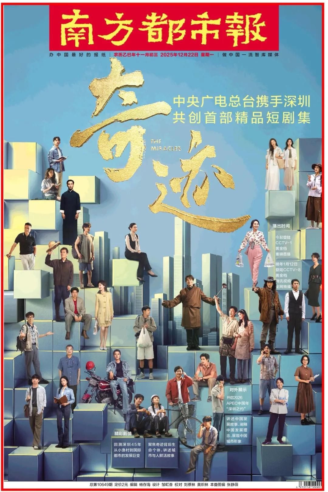 此外,2025年是深圳经济特区成立45周年。《奇迹》用短小精悍的短剧集形式,回溯深圳45年来从小渔村到国际化都市的发展巨变。2026年,亚太经合组织(APEC)第三十三次领导人非正式会议将在深圳举行,这部以深圳经济特区发展历程中的人与事为原型和素材、讲述中国式现代化奇迹和中国人民追求美好生活故事的精品短剧集,也将开启2026APEC中国年“深圳之约”的文艺序章。