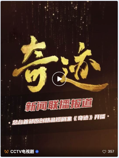 短剧首次登陆总台央视一套黄金档,也被行业内外认为具有开创性价值、风向标意义。众多国内主流媒体连续发文,点赞《奇迹》的短剧集叙事、表达方式和时代意义: