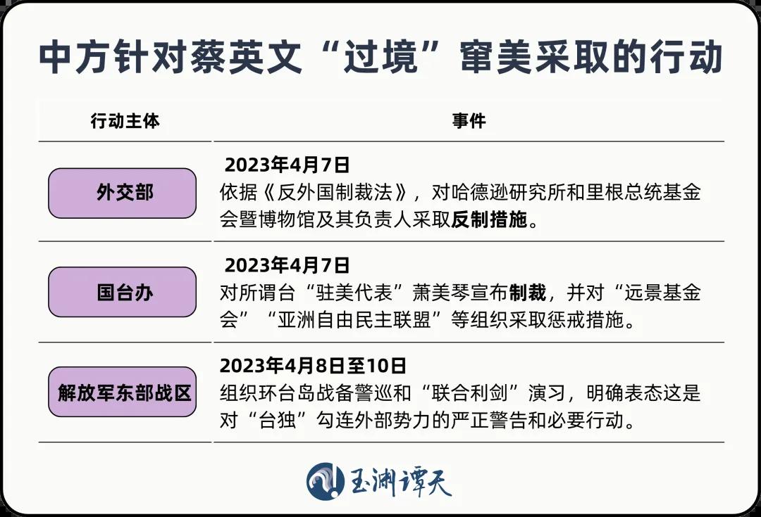 针对蔡英文“过境”窜美从事政治活动,中国外交部对哈德逊研究所和里根总统基金会暨博物馆及其负责人采取制裁措施,随后持续推进的,还有军事演习等行动。