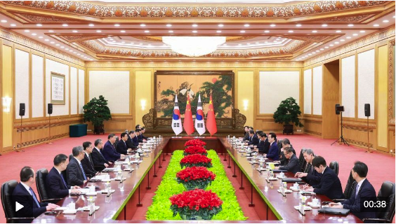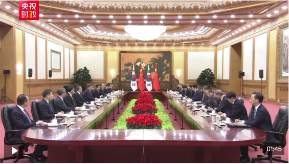 习近平指出,当前世界百年变局加速演进,国际形势更加变乱交织。中韩在维护地区和平、促进全球发展方面肩负重要责任,有广泛利益交集,应当坚定站在历史正确一边,作出正确战略选择。80多年前,中韩两国付出巨大民族牺牲,赢得抗击日本军国主义的胜利。今天更应携手捍卫二战胜利成果,守护东北亚和平稳定。作为经济全球化的受益者,中韩要共同反对保护主义,践行真正的多边主义,为推进平等有序的世界多极化、普惠包容的经济全球化作出贡献。