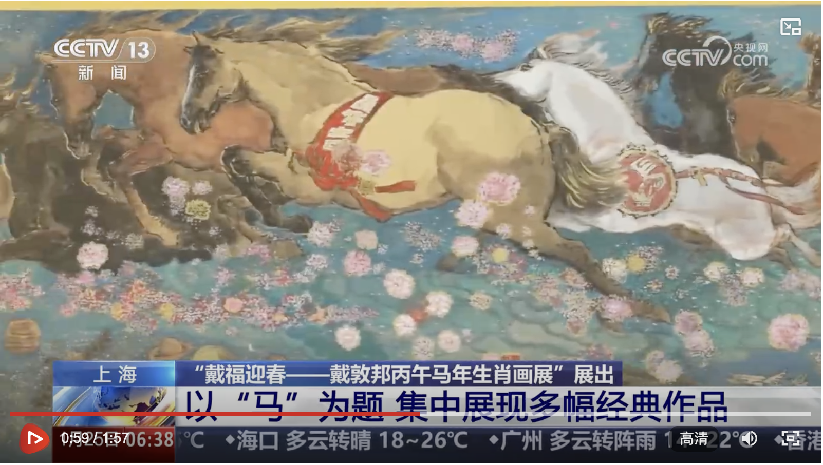 上海交通大学人文学院教授、国画家戴敦邦:《天马行空》就表示这个马的奔腾就是像(在)天空上一样前进,这是象征着一种祝福。我们的国家、我们的人民就是像马一样奔腾,奔腾四海、辉煌发达。
