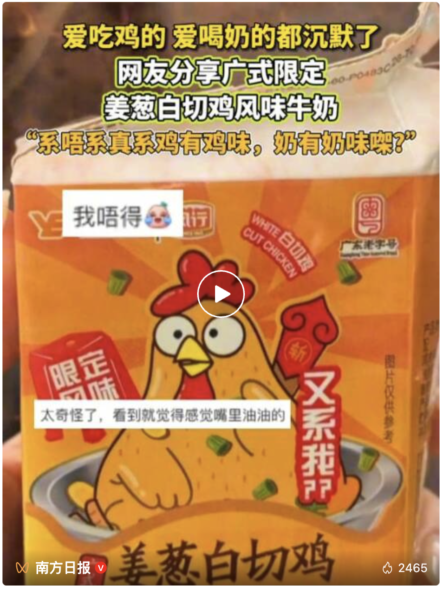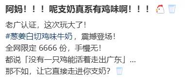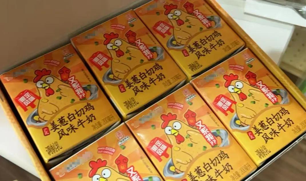 据了解,这款新品将白切鸡的经典姜葱风味与牛奶进行融合,售价5元/盒,主打线上渠道限量发售。品牌方的介绍语是:“鸡有鸡味,奶有奶味!”
