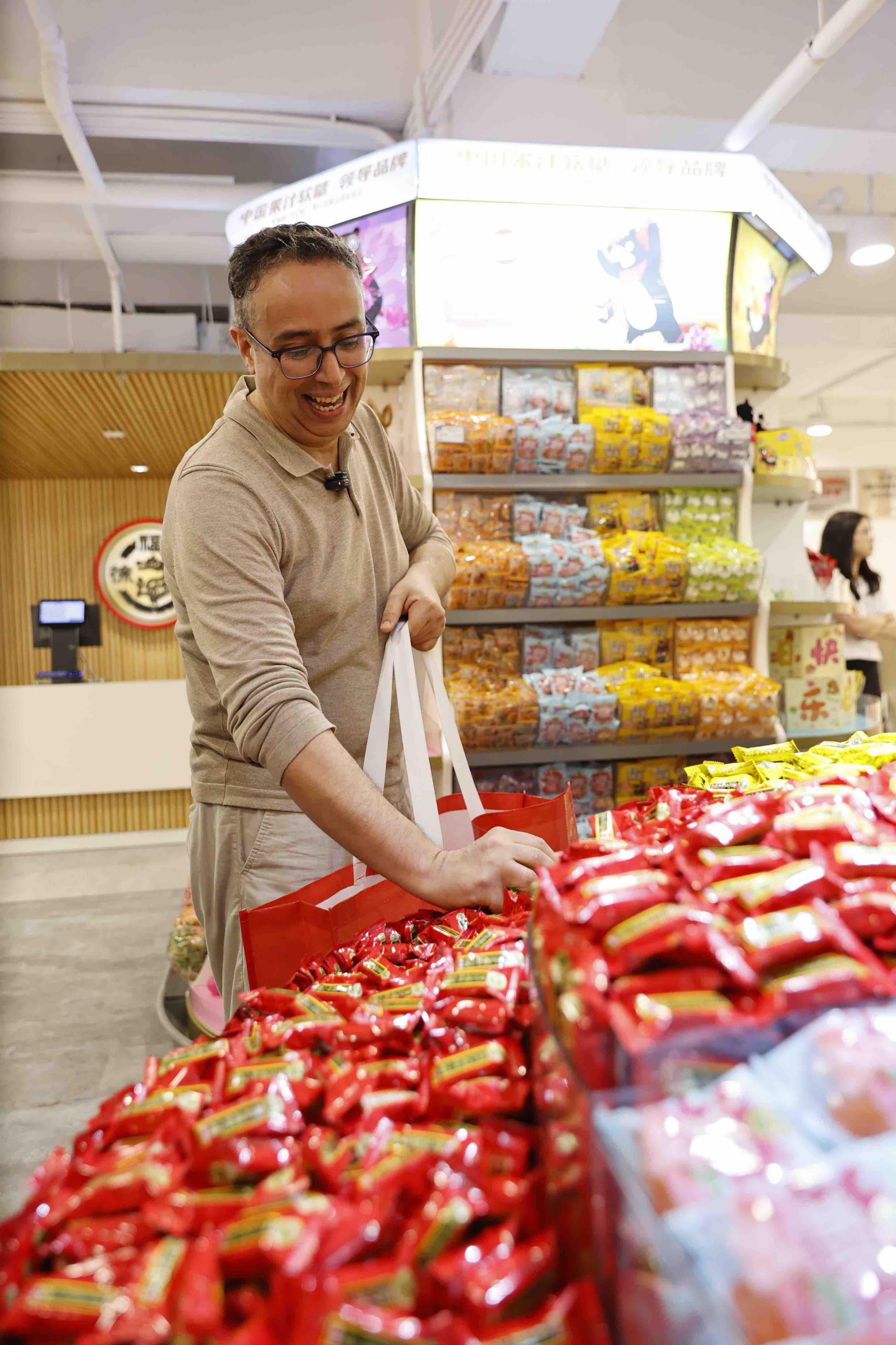 随后,Karem走进橡皮糖智能化生产车间,通过透明参观通道,近距离观看橡皮糖从熬煮、成型、检验到包装的全自动化流程。干净整洁的车间、高效精准的设备、严格细致的品控环节,让Karem连连赞叹。他现场抽取橡皮糖盲盒,品尝薄荷味果汁橡皮糖,清甜的口感让他频频点头。在工作人员的带领下,Karem还换上专业工作服,亲手体验花生酥制作工艺。揉面、塑形、烘烤,十多分钟后,专属“Karem版”花生酥新鲜出炉,他尝过后笑着说:“很好吃,很香很甜!”