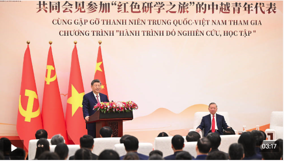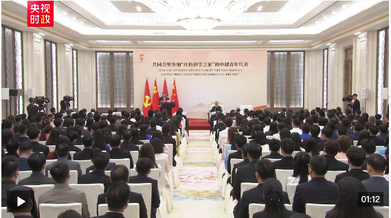 习近平发表讲话,表示去年我和苏林总书记一道启动“红色研学之旅”项目,一年来,两国青年共同探寻中越友好的红色基因,感受中国式现代化的万千气象,在中国各地留下许多互学互鉴、相知相亲的生动故事。不久前,我收到越南河内国家大学外语附中等学校的同学们用中文写来的信,分享了参加“红色研学之旅”的深刻感悟,立志做中越友谊的传承者和传播者,我感到很欣慰。