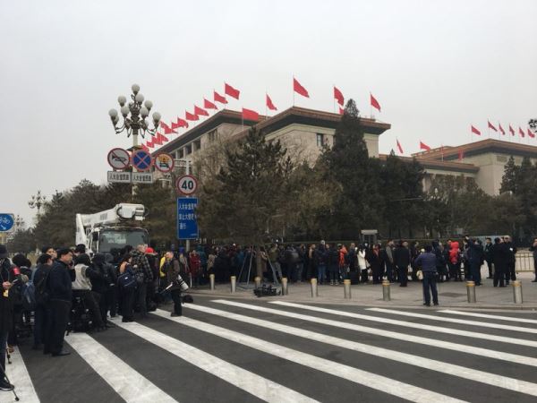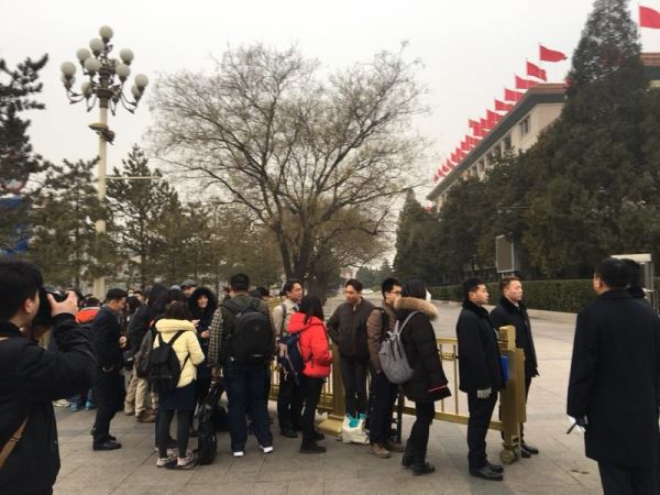 一大早,中外记者在人民大会堂外排起了长队,等候进场。今年,采访两会的境内记者2000人左右,港澳台记者和外国记者1000多人。