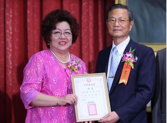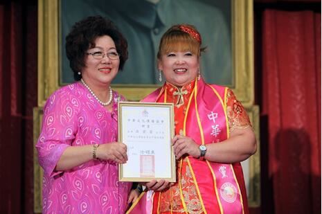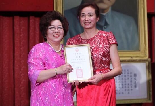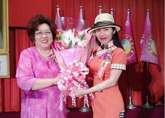 世界纪录认证官余淑琴(右)祝贺涂明慧当选台湾中华妇女党主席