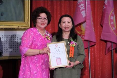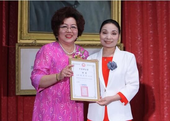 台湾中华妇女党主席涂明慧(左)向吴碧雪女士颁发中华文化传播协会台中市艺术总监