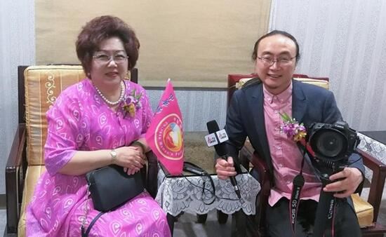 北欧国际新闻中心副总裁/澳门卫视运营总监刘继明(右)现场采访台湾中华妇女党主席涂明慧女士