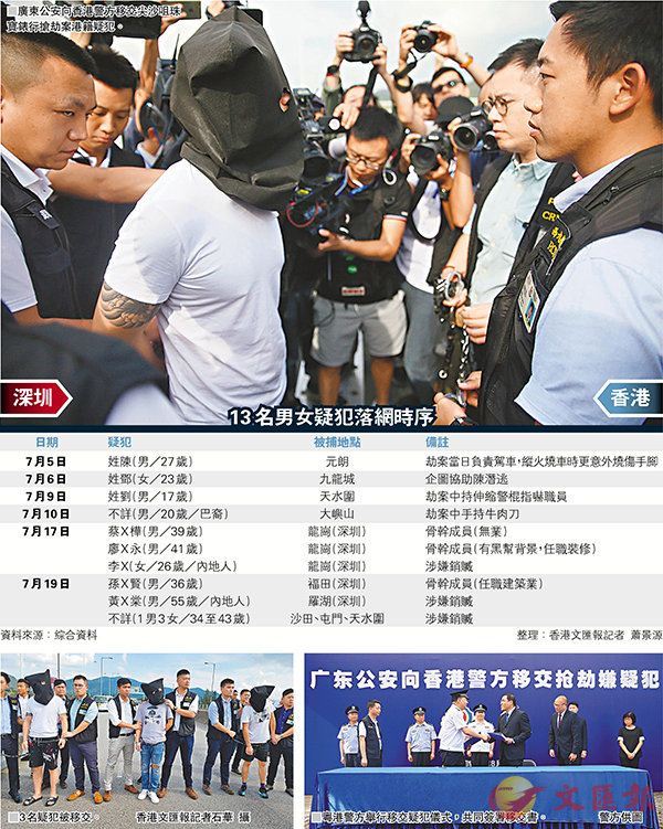 香港文匯報訊(記者 敖敏輝、 蕭景源)在國家公安部指揮下,廣東省公安廳與本港警方聯手,上月19日成功偵破同月「七一」香港回歸紀念日,在尖沙咀發生的2,310萬港元珠寶錶行劫案,至今兩地合共拘捕13名疑犯,其中5人在深圳落網,包括案中3名本港主犯。粵港警方昨在皇崗口岸舉行儀式,共同簽署移交書,由本港警方接收3名主犯以及12隻總值800多萬元的手錶贓物。警方指案中仍有兩名男子在逃。