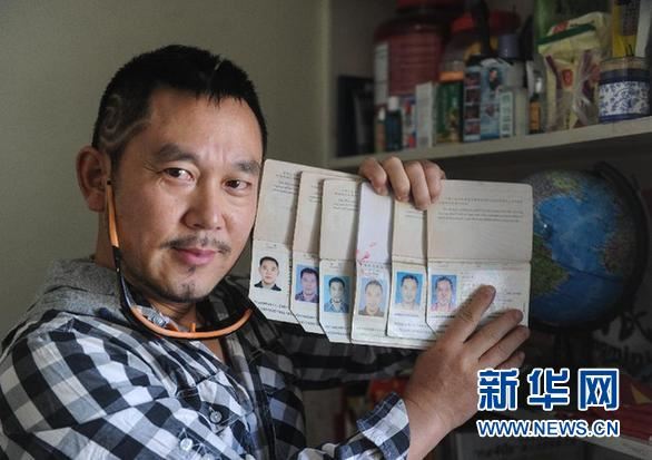 孙剑在北京租住的房间里展示他盖满了各国签证印章的6本护照(12月14日摄)。 新华社记者 罗晓光 摄