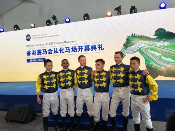 左起:本港骑师蔡明绍、田泰安、潘顿、杨明纶、韦达及潘明辉齐撑从化马场开幕礼