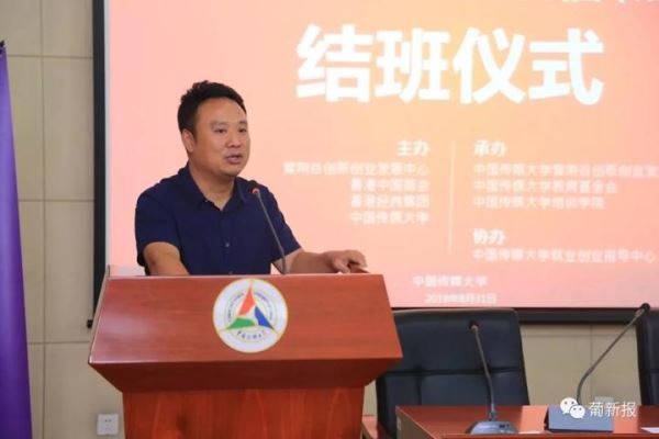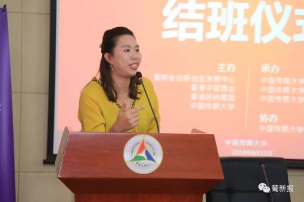 杜莎莎经理表示,很开心和大家相处了12天,今年是改革开放40周年,我们这期的创新创业训练营能够在北京这个福地举办,是件非常有意义的事情。她代表香港经纬集团主席陈经纬先生和执行总裁陈亨利先生对本期短视频内容创新创业特训营的成功举办以及大家顺利结业并且成为中国传媒大学的校友表示热烈的祝贺。杜莎莎经理还分享了陈经纬主席的一句话给大家:“当前国家经济发展进入速度变化、结构转型和动力转换的关键时期,面对新的形势,港澳企业和青年人以及广大华商尤其是华侨华人后裔年轻一代应抓住机遇、乘势而上、相向而行,积极融入“大众创业、万众创新”,在“一带一路”建设中发挥独特作用。”