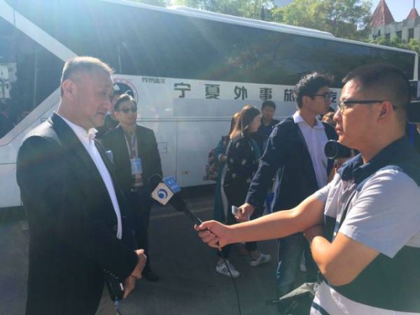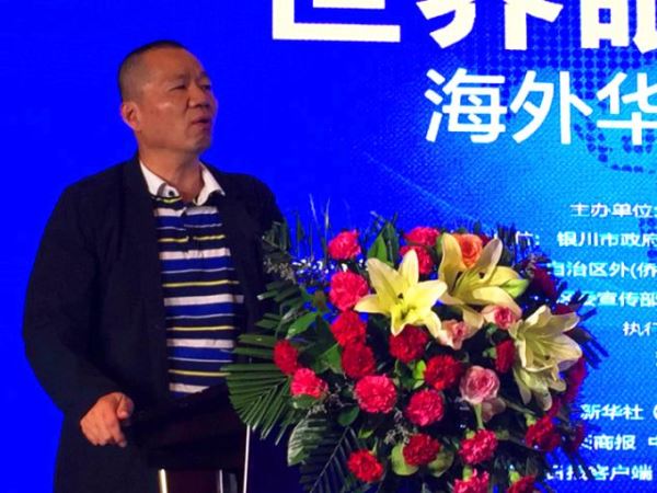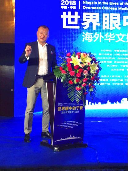(本次华媒代表团的团长、《欧洲新报》总编辑范轩致辞。他从小时候“偷吃枸杞”的记忆开始,讲述了对宁夏的印象,分享了其与宁夏的故事,鼓励同行人走进宁夏、认识宁夏、了解宁夏、进而宣讲宁夏。他说:“我们一定把宁夏的好山好水好沙漠、好吃好玩儿好黄河,通通打个包带到国外去宣讲、去介绍”。)