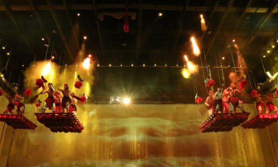经过无数次的探讨论证,无数个日夜的连续奋战,最终成功完成了挑战,使《沙坡头盛典》实现了在8000平方米的剧场内让观众置身其中,除了能体验到传统视觉的3D效果和环绕式的听觉效果外,还能从嗅觉、触觉、味觉、体感以及心理情感等层面产生触动;在熔岩烈狱到冰雪世界不到30米的距离内,从45℃的炙烤骤然降至10℃寒风瑟瑟、雪花飘飘。