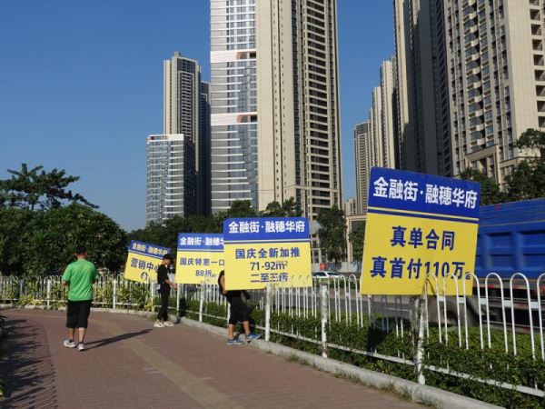 图:国庆期间,开发商为吸引看房者,在路边摆满醒目的广告牌/大公报记者卢静怡摄