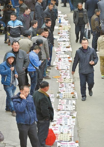 2月5日,成都锦江区(微博)人力资源市场,各种招工广告铺成长龙。